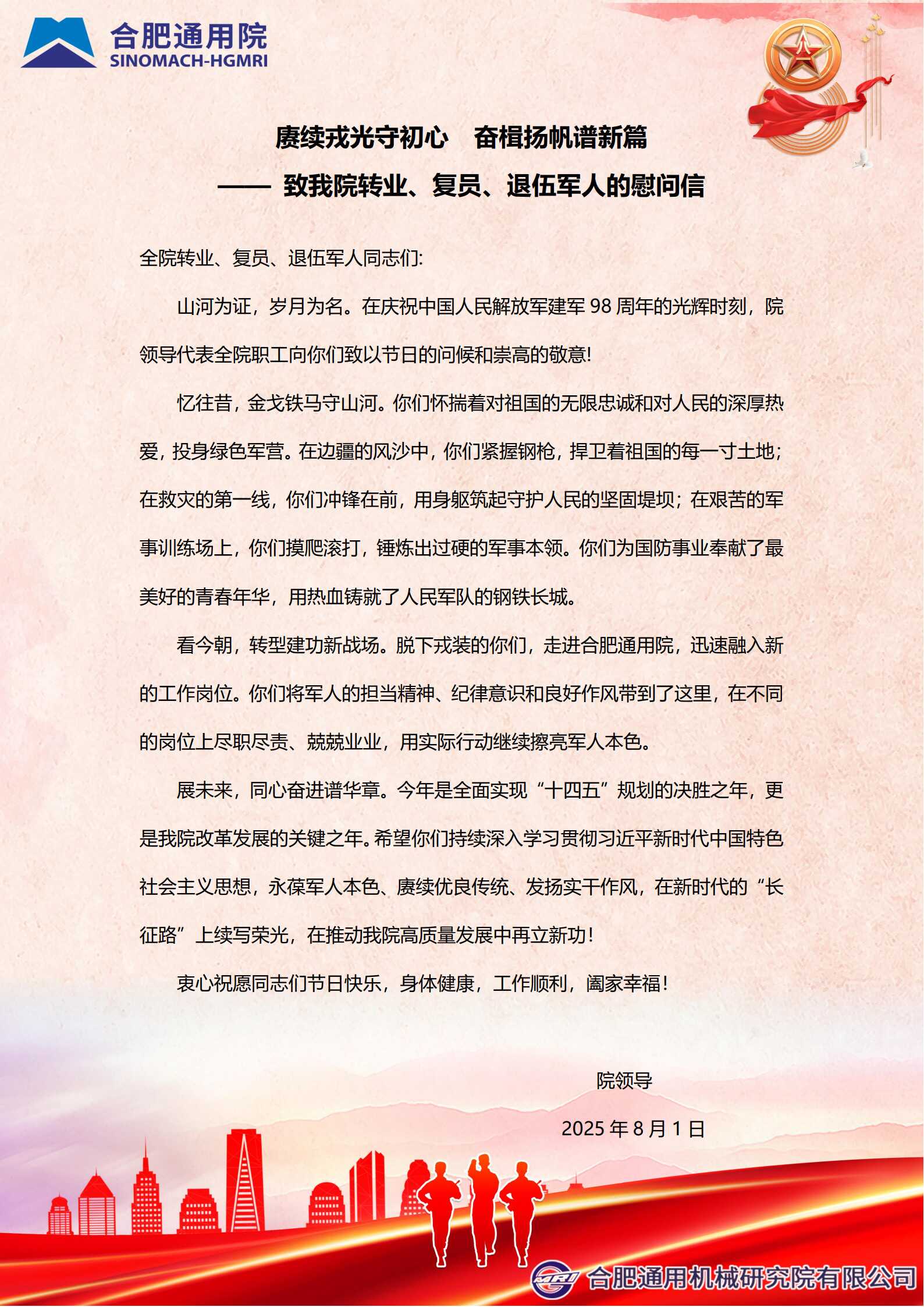 賡續(xù)戎光守初心 奮楫揚(yáng)帆譜新篇 —— 致我院轉(zhuǎn)業(yè)、復(fù)員、退伍軍人的慰問信
